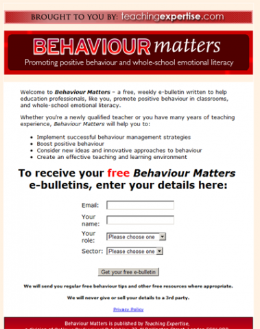 This teaching expertise site offers free education resources, articles and e-bulletins, advice and guidance, knowledge sharing and ideas across topics including behaviour management. Behaviour Matters is a free weekly e-bulletin written to help education professionals promote positive behaviour in classrooms and whole school emotional literacy.
