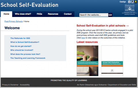 School Self-Evaluation (SSE) provides opportunities for schools to examine their own practice within their own context and to report on their strengths and areas for improvement to their own school community. This DES website contains information and resources on SSE.