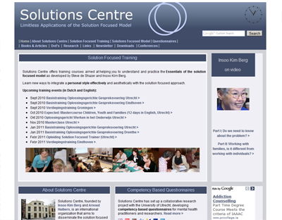 Insoo Kim Berg and Arnoud Huibers, founded Solutions Centre, an international organisation which aims to disseminate the Solution-Building Model through training and consultation. A competency-focused questionnaire for working with children is available for download from the website.