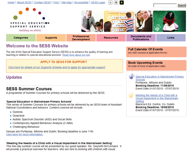 The Special Education Support Service (SESS) co-ordinates, develops and delivers a range of professional development initiatives and support structures for school personnel working with students with special educational needs in mainstream primary and post-primary schools, special schools and special classes in Ireland. The site contains useful information and resources across a range of areas.