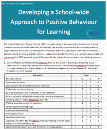 To support at Level 1 a systematic, evidence-based approach to the planning and work with partner schools, the NBSS has developed an extensive quantitative and qualitative questionnaire to be completed by staff members in participating schools. The questionnaire is designed to gain staff perspectives on the persistence of specific types of low-level behaviours; patterns of low-level disruption across year groups; staff and student knowledge of rules and sanctions; opinions regarding the efficacy of sanctions; consistency of enforcement and communication within the school; as well as providing an opportunity for respondents to identify and acknowledge those strategies that are currently working for them in the classroom.