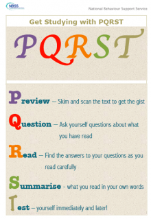 Study skills are strategies and methods of purposeful learning, usually centered around reading and writing. Effective study skills are essential for all students. The PQRST Method is a study reading strategy that helps students tackle textbook material in a strategic manner. It is designed to help students optimise their reading and learning.This resource can be used with students in conjunction with a study skills NBSS questionnaire and powerpoint presentations on learning.