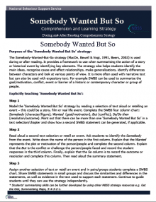 The Somebody-Wanted-But-So strategy is used during or after reading. It provides a framework to use when summarising the action of a story or historical event by identifying key elements. The strategy also helps students identify the main ideas, recognise cause and effect relationships, make generalisations, identify differences between characters and look at various points of view. Explicitly teaching key reading comprehension and learning skills - making connections, self-questioning, visualising, inferring, determining importance, summarising, synthesising and self-monitoring - can help students become more purposeful, active readers, thinkers and learners.