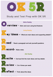 Effective study and test preparation skills are essential for all students. The OK 5R Method is a study strategy that helps students tackle textbook material in a strategic manner. Students who use a study system read with greater comprehension and remember more.This resource can be used with students in conjunction with a study skills NBSS questionnaire and powerpoint presentations on study, memory and learning.